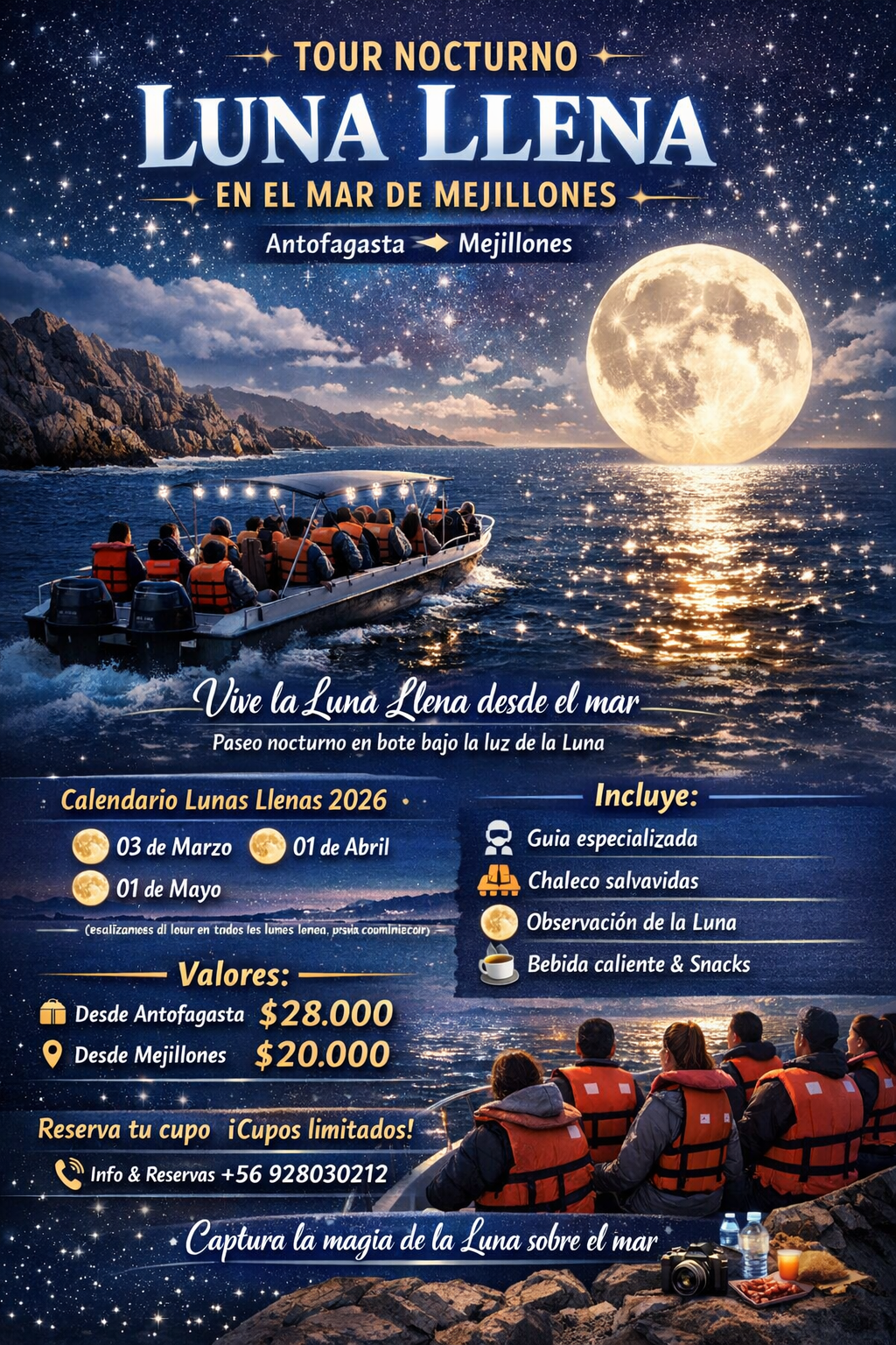 🌕✨ Tour Nocturno Luna Llena – Mar de Mejillones ✨🌕